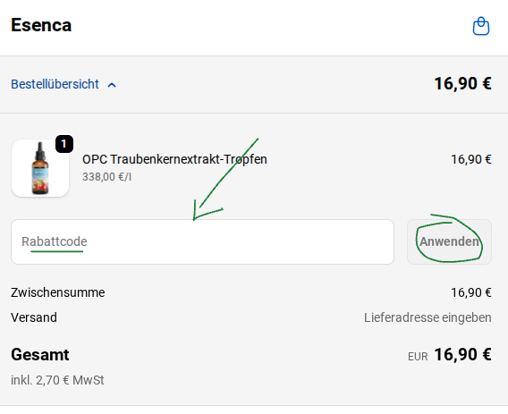 - Trage Deinen Esenca Gutscheincode dort ein und bestätige die Eingabe mit einem Klick auf „Einlösen“ oder „Anwenden“.