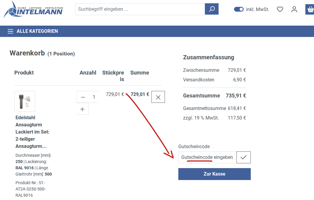 - Im Feld „Gutscheincode eingeben“ den Rabattcode eingeben.