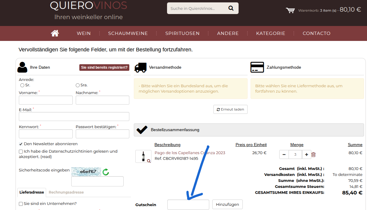 Die Einlösung eines Gutscheincodes ist bei QUIEROVINOS einfach und schnell: